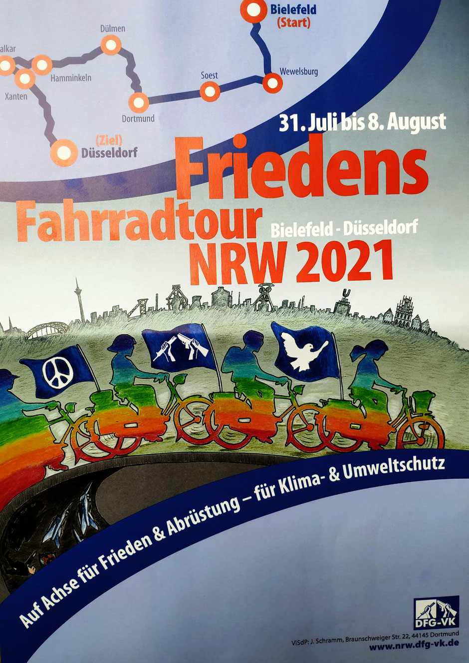 Auch in Zeiten von Corona gehen Aufrüstung und Konfrontationspolitik weiter. Daher sind Friedensaktionen dringend angesagt. Anfang August sind wir wieder eine Woche mit dem Fahrrad für Frieden und Abrüstung unterwegs, quer durch NRW, von Bielefeld nach Düsseldorf. Wir erinnern an den 80. Jahrestag des Überfalls Nazi-Deutschlands auf die Sowjetunion, besuchen Gedenkstätten für hier gestorbene sowjetische Kriegsgefangene. Und wir fahren zu Orten der heutigen Konfrontation zwischen NATO und Russland, um dort für Abrüstung und Entspannung zu demonstrieren. Auch das Gedenken an Hiroshima und Nagasaki wird wieder Teil der Tour sein, die Forderung nach atomarer Abrüstung bei uns und weltweit.